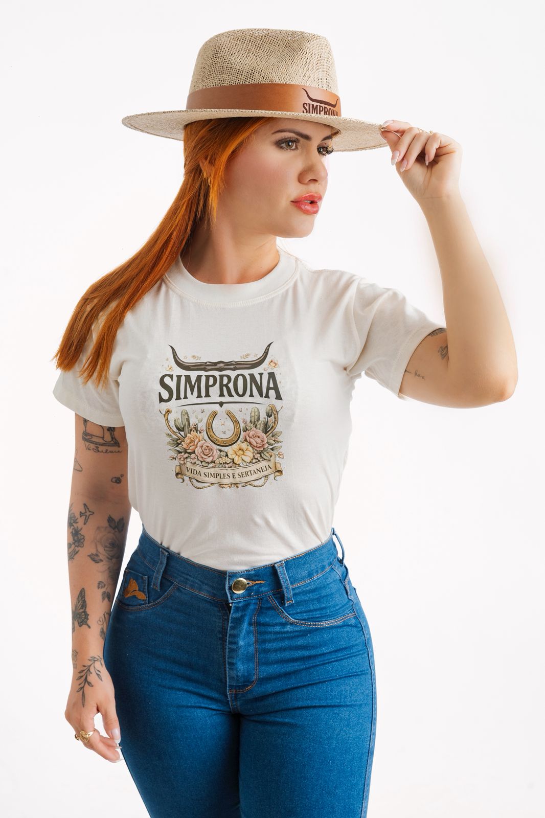 Camiseta Simprona off white com estampa country exclusiva, modelagem confortável e estilo delicado e autêntico.